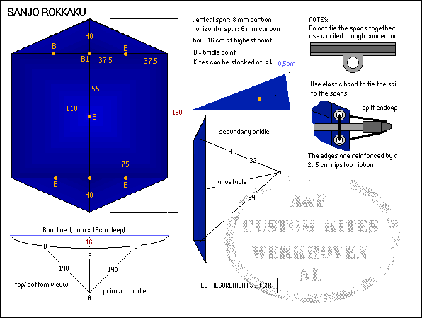 La cometa tetraédrica se puede clasificar entre las celulares o como diédrica. Esta compuesta de múltiples celdas con forma de tetraedro revestido por los dos lados. [ Plano ] |