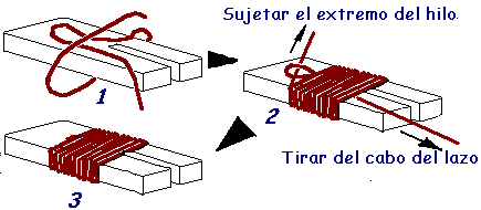1) Prepará el lazo corredizo y fijalo con vueltas de hilo 2) Pasá el extremo del hilo por el lazo. 3) Tirá del cabo suelto del lazo. El cabo del hilo debe estar bajo la mitad del manguito 4) Encolar